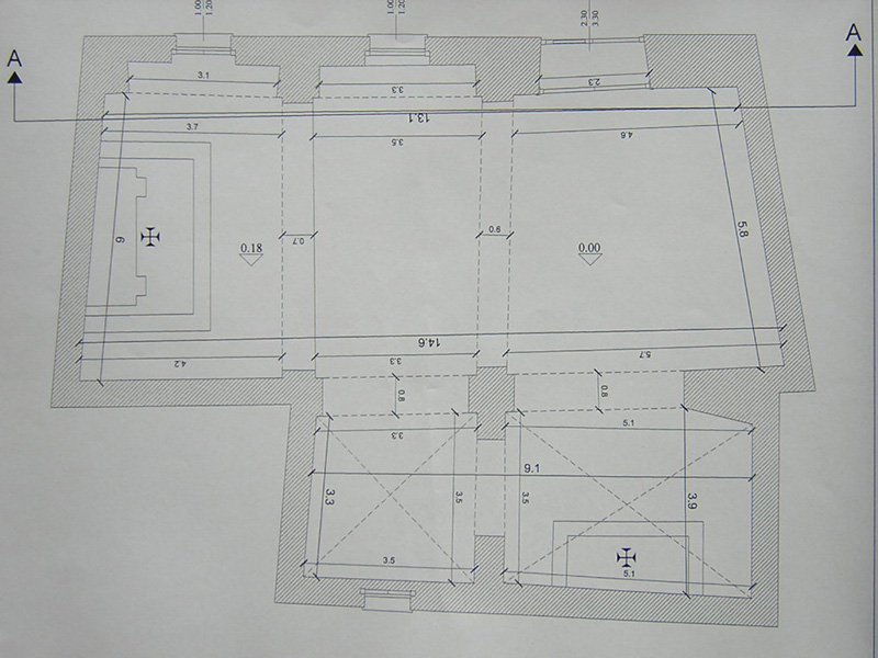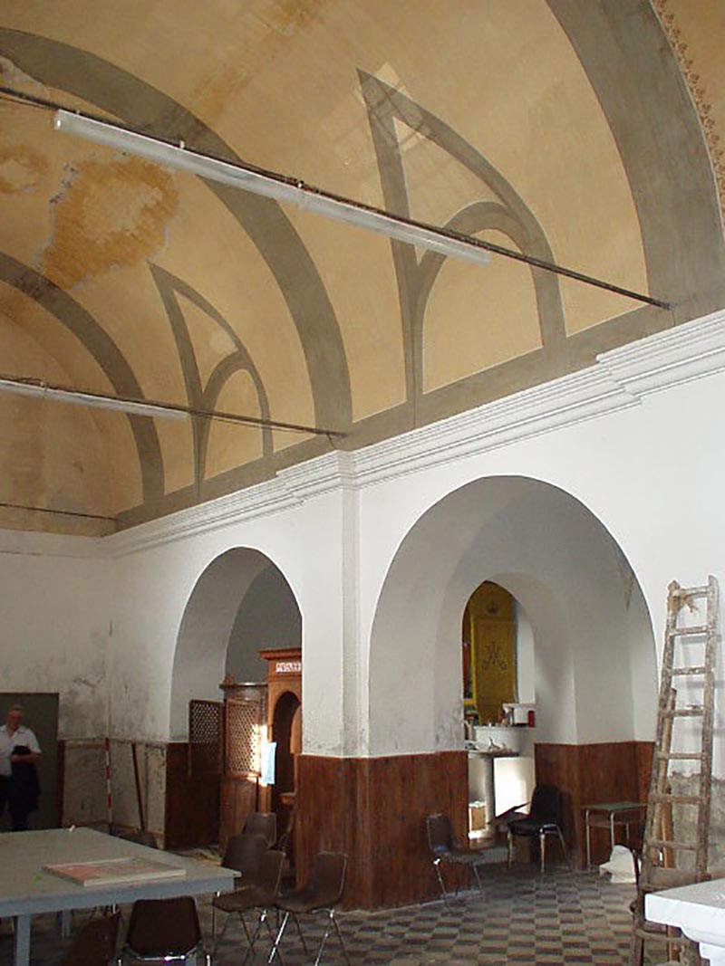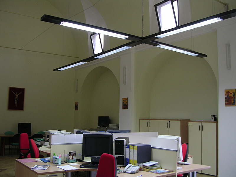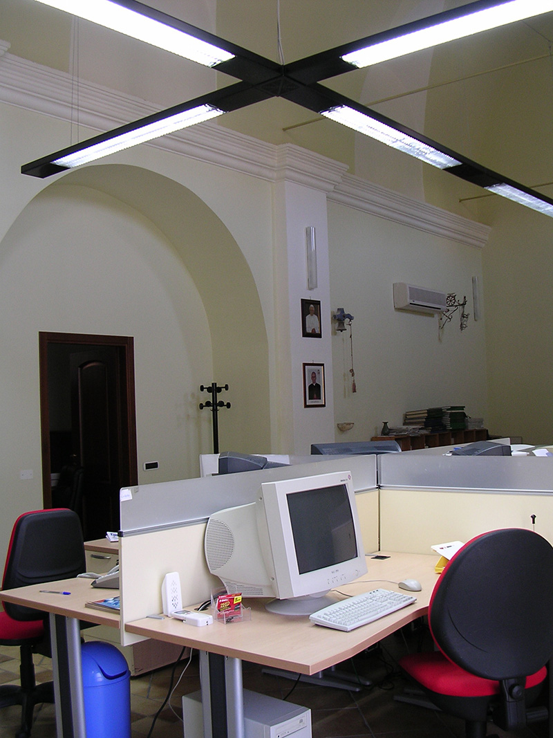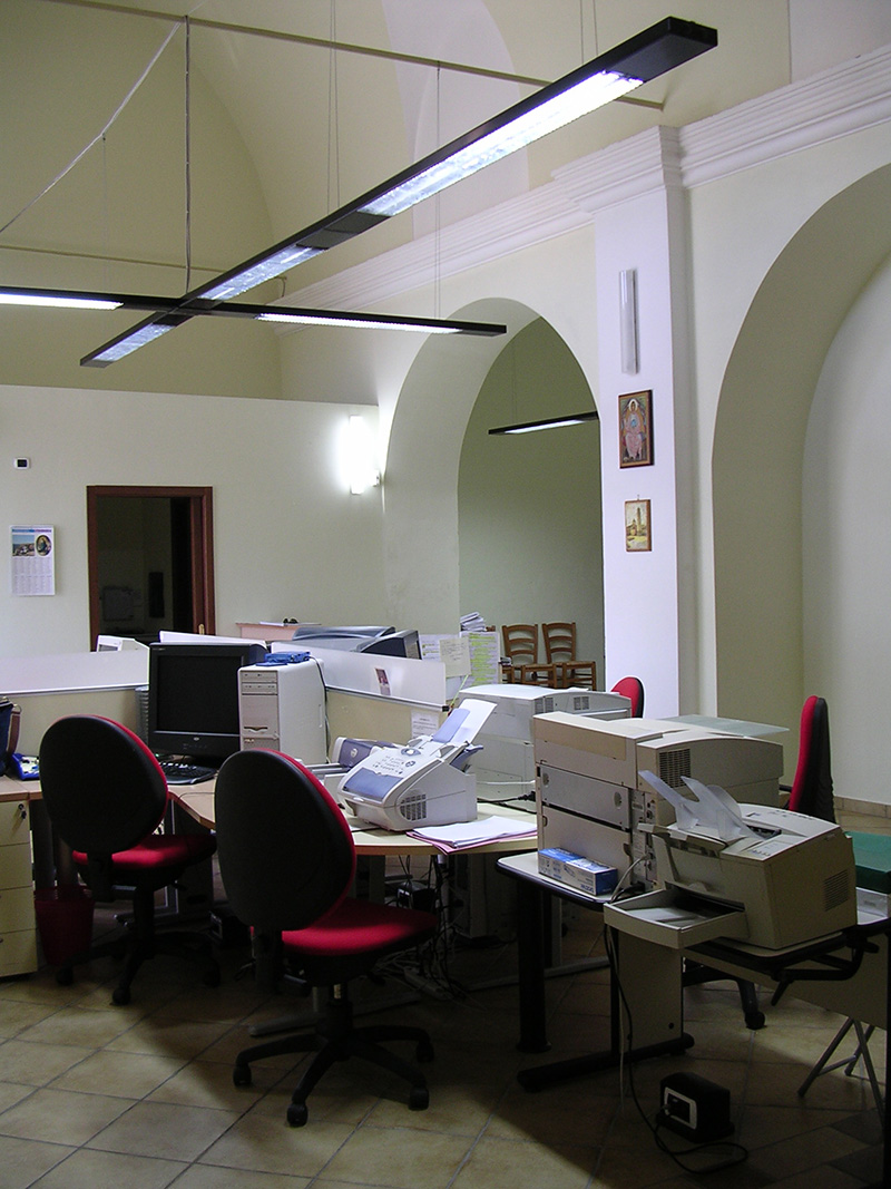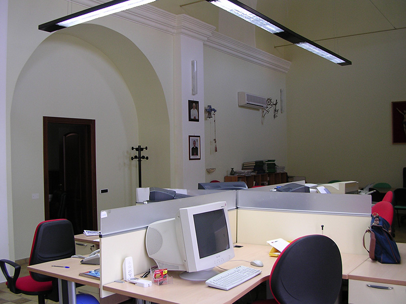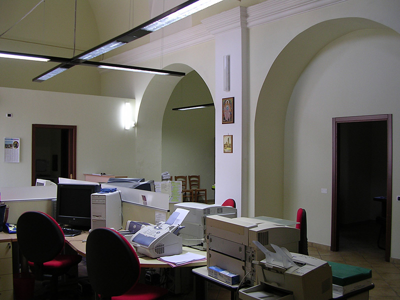 Dopo l’esecuzione di un accurato rilievo, si è dato inizio all’esecuzione di saggi sulle murature e nella pavimentazione per verificare la causa delle infiltrazioni ed individuare le migliori soluzioni tecniche. La progettazione preliminare architettonica è stata condivisa con la redazione del settimanale diocesano, al fine di adeguare i locali alla nuova destinazione. Nella navata principale ha trovato collocazione tutta la redazione del giornale in un unico ampio open space con l’attigua sala per riunioni. L’amministrazione e la direzione sono stati realizzati nella vanata laterale con ambienti appositamente dedicati.